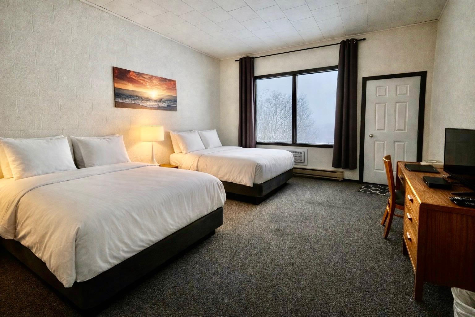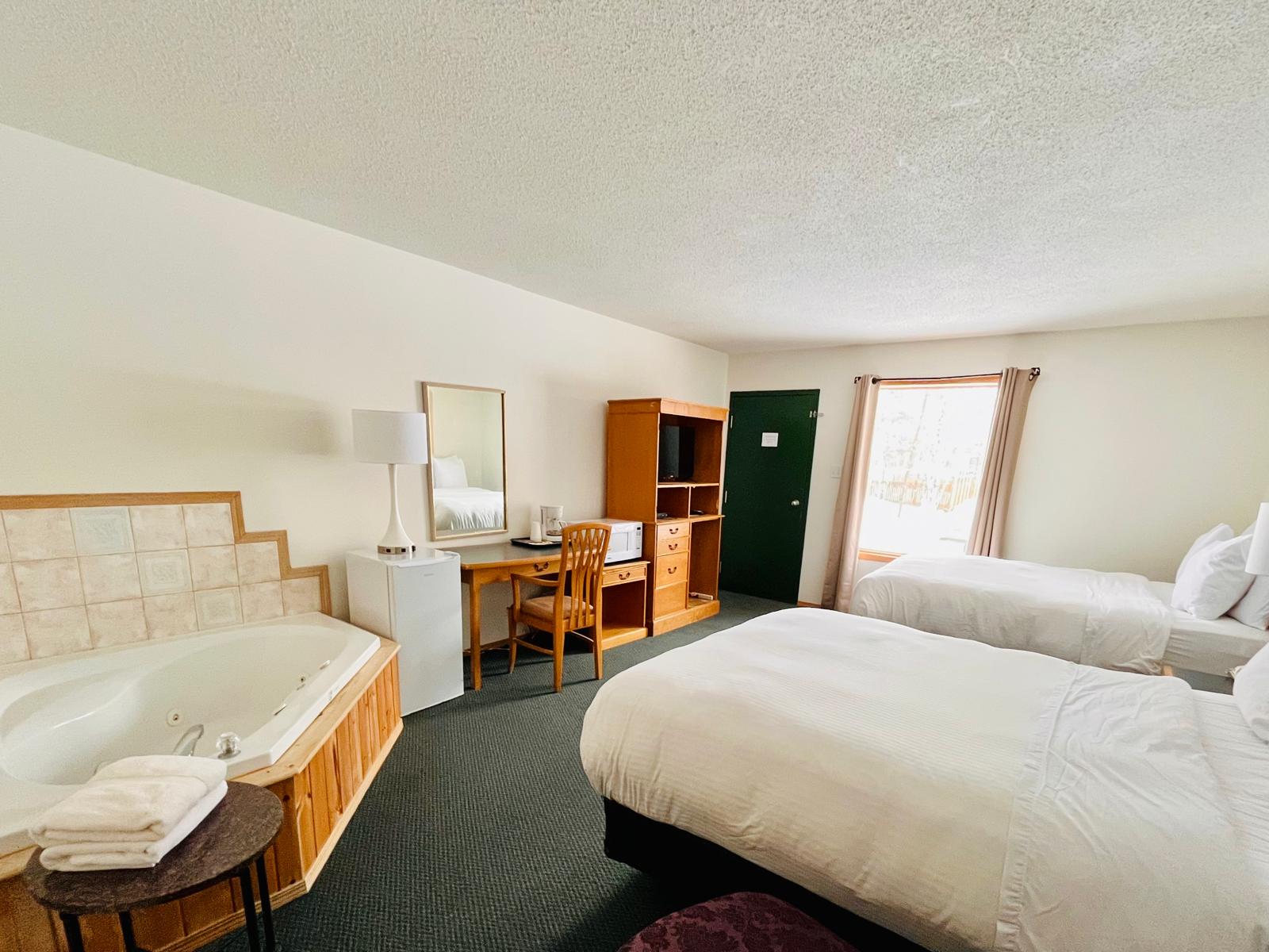 Relax in our cozy Jacuzzi motel room, featuring two queen beds and space for up to four guests. Enjoy your private jacuzzi along with a fridge, microwave, coffee maker, phone, and satellite TV.